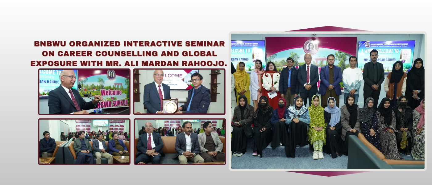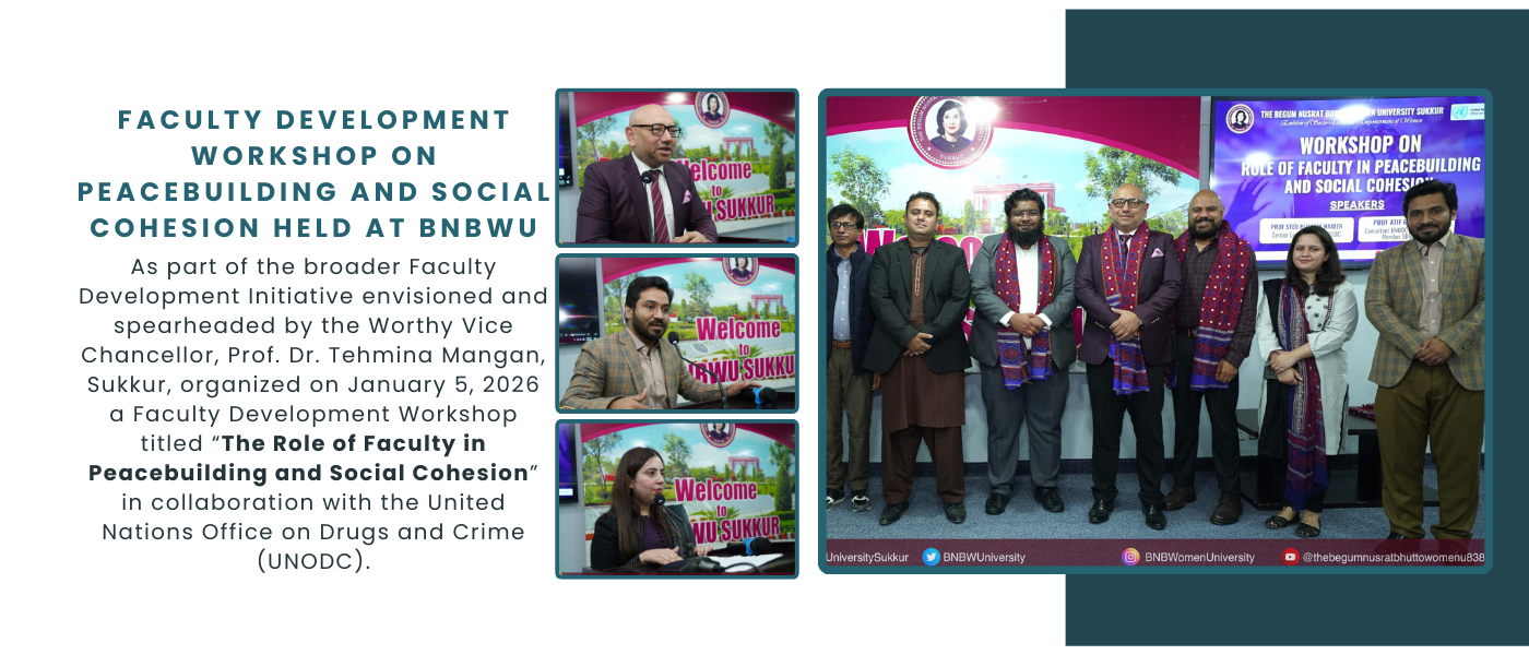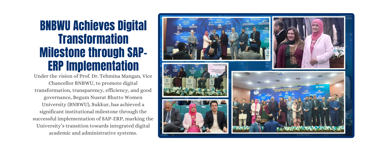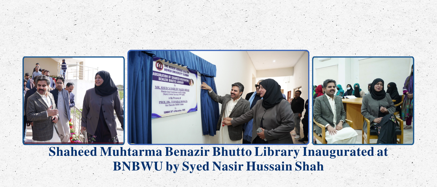 The Begum Nusrat Bhutto (BNB) Women University Sukkur was established with the sole objective to empower, facilitate and inspire Women with ambition. BNB Women University aims to enable capable women by providing quality education alongside exposure to endless opportunities for their socio-economic growth. Women's participation is essential in all professional fields including Education, Technology, Management, Engineering, Politics, and Legislation among others.