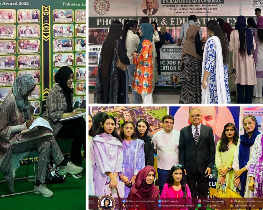 With the vision of Honorable Vice Chancellor, Prof. Dr. Tehmina Nangraj, to enhance studentsโ learning through participation in academic events, exhibitions, and industry linkages, the students of Begum Nusrat Bhutto Women University (BNBWU), Sukkur, participated in the Pakistan Hindu Council (PHC) Job Fair & Education Expo. The event was organized by Dr. Ramesh Kumar Vankwani, Patron-in-Chief of the Pakistan Hindu Council and Member of the National Assembly of Pakistan.