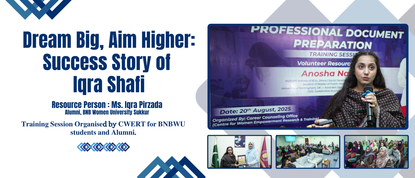 At The Begum Nusrat Bhutto Women University (BNBWU), we are committed to guiding our students toward meaningful, empowered, and purpose-driven careers. Under the visionary leadership of Worthy Vice Chancellor Prof. Dr. Tehmina Mangan, the Career Counselling Office serves as a vital support hub offering students the guidance, tools, and confidence they need to navigate the evolving world of work.