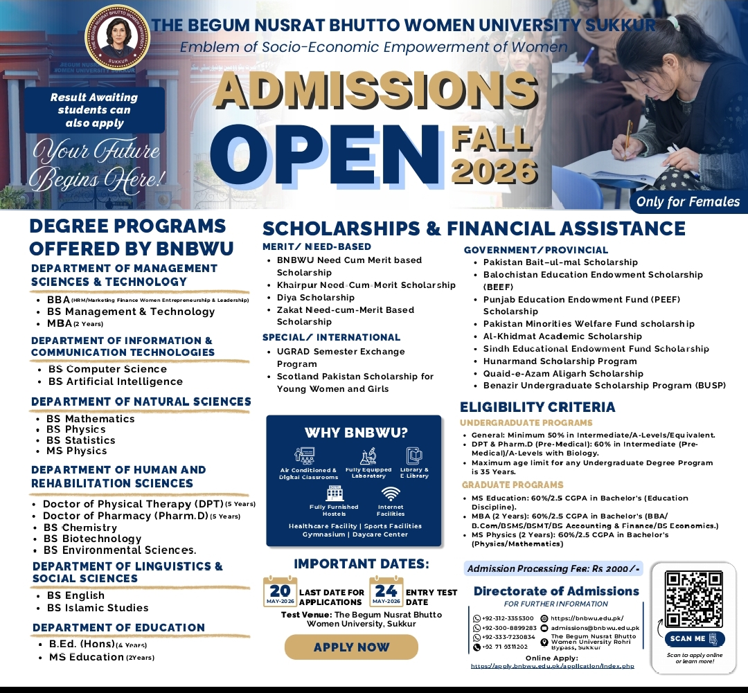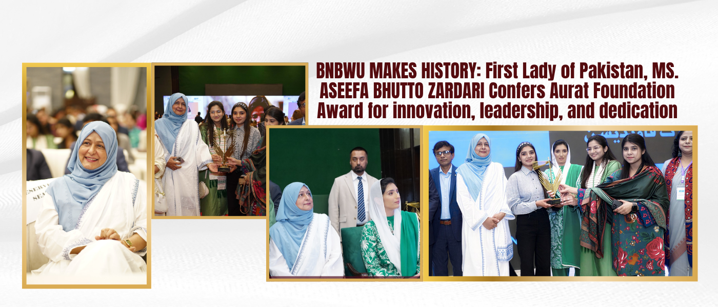 The Begum Nusrat Bhutto (BNB) Women University Sukkur was established with the sole objective to empower, facilitate and inspire Women with ambition. BNB Women University aims to enable capable women by providing quality education alongside exposure to endless opportunities for their socio-economic growth. Women's participation is essential in all professional fields including Education, Technology, Management, Engineering, Politics, and Legislation among others.